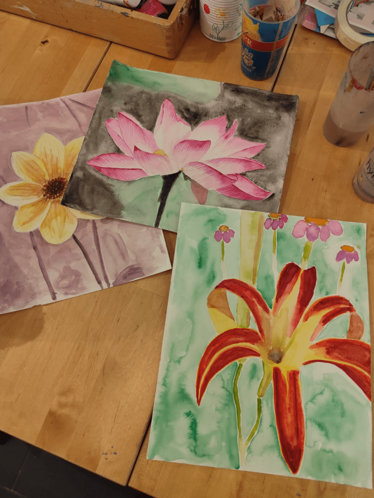 À travers aquarelles florales, linogravures, collages et techniques mixtes, Itariye explore la rencontre entre le végétal et le féminin.